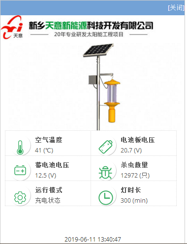 支持手机App与Web端控制,具有丰富的状态信息展示,足不出户就可以了解一切,如地理位置、设备编号、基地名称、物联网卡卡号、剩余流量、卡有效期、杀虫次数、GSM天线连接是否正常等故障报警信息。可远程控制、查看设备的当前工作状态、信号强度、电量使用等情况。