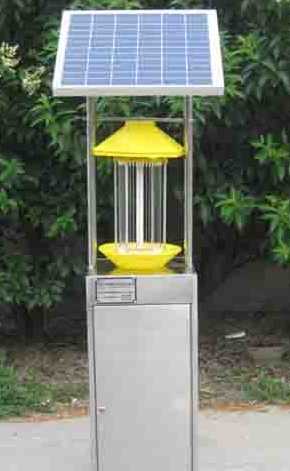利用太阳能电池板作为用电来源,其将白天太阳能发的电贮存起来,晚内上放电容给杀虫灯具,供其工作。杀虫灯具是利用365±50nm波长紫外光对昆虫具有激备较强的趋光、趋波、趋色、趋性的特性原理,确定对昆虫的诱导波长,研制专用光源,利用放电产生的低温等离子体,紫外光辐射对害虫间生的趋光兴奋效应,引诱害虫扑向灯的光源,光源外配置高压击杀网,杀死害虫,使害虫落下专用的接虫袋内,达到灭杀害虫的目的。